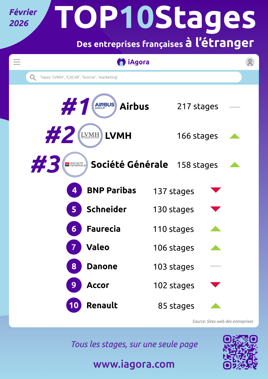 Le Top-10 des stages à l'étranger - Entreprises françaises - Février 2026